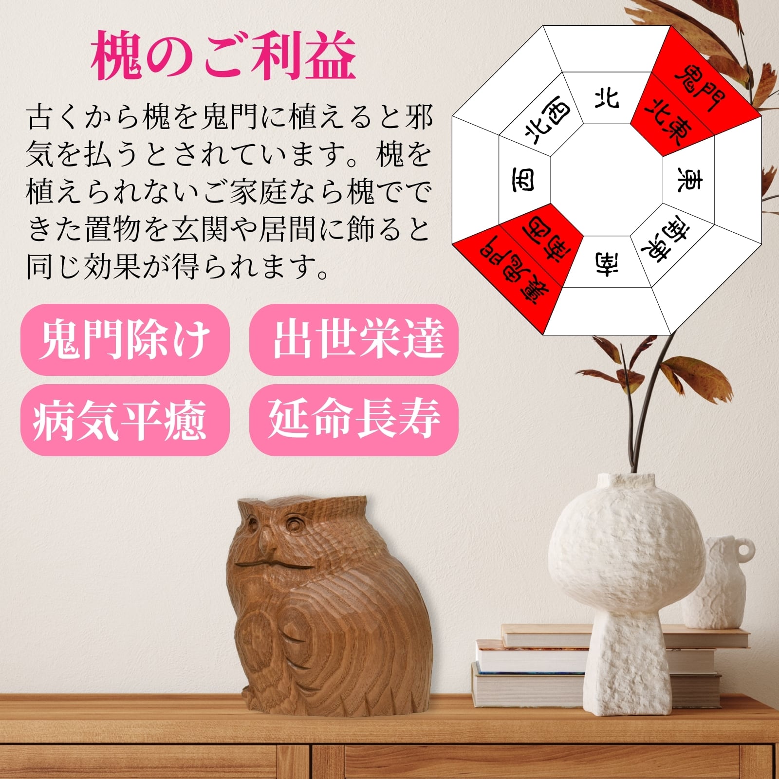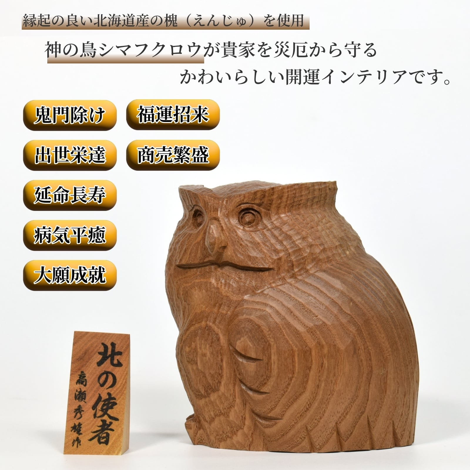 高瀬秀雄が槐の風合と木目を生かし、彫刻刀で一刀一刀丹念に彫り上げた作品は木彫りらしい温もりと素朴さを感じさせてくれます。鬼門除けのご利益があり槐でできた守り神のシマフクロウを貴家の床の間やリビング、玄関に飾れば空間を格調高く演出し、貴家の無病息災、家運隆盛をもたらしてくれます。長寿祝いや開店祝い、快気祝いなどのプレゼントにもおススメ。縁起の良い高瀬秀雄渾身の木彫り作品を、ぜひこの機会にお求めください。